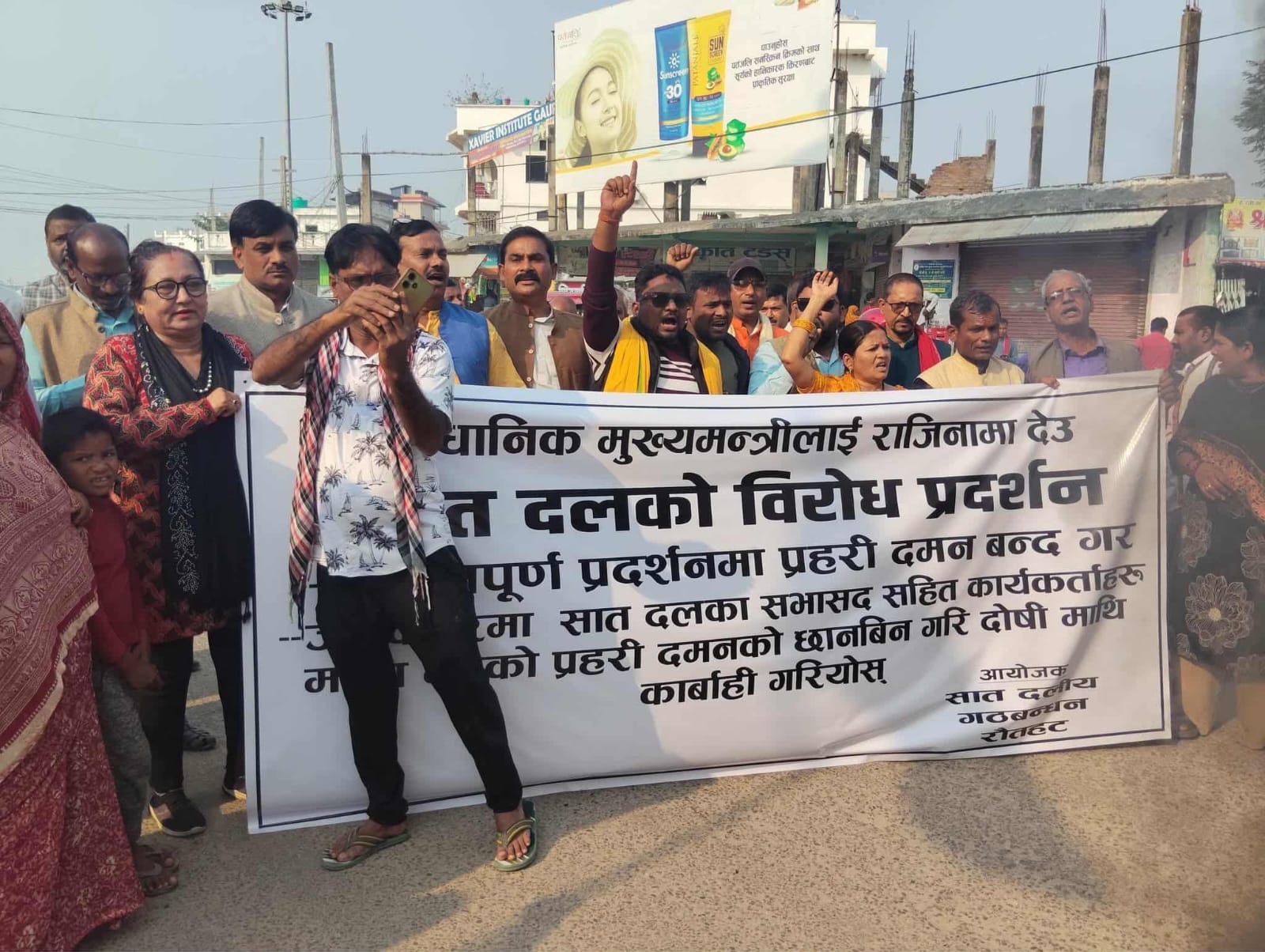 मधेस प्रदेशका मुख्यमन्त्री सरोजकुमार यादवको असंवैधानिक नियुक्तिको विरोधमा रौतहटको सदरमुकाम गौरमा सातदलीय गठबन्धनले बिहीबार दोस्रो दिन पनि संयुक्त रूपमा विरोध प्रदर्शन गरेको छ।