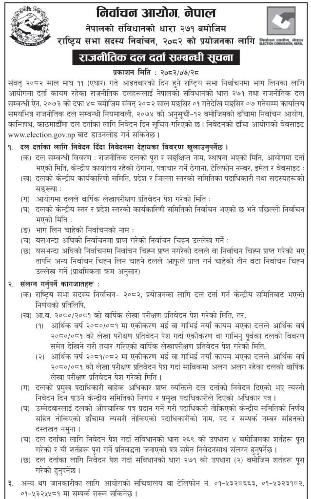 निर्वाचन आयोगले प्रतिनिधि सभा र राष्ट्रिय सभा सदस्य निर्वाचनका लागि दल दर्ता आह्वान गरेको छ।
