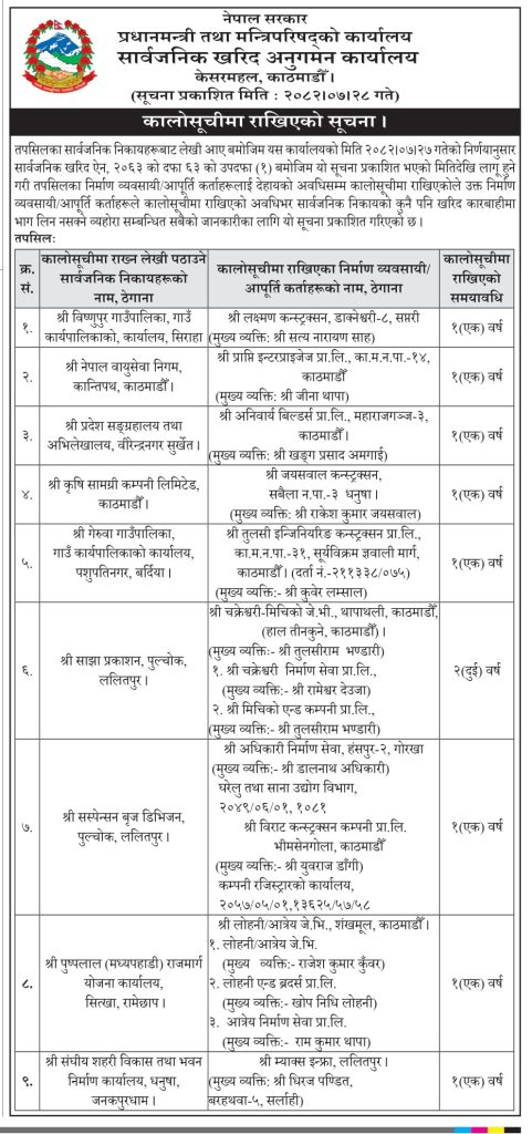 सरकारले विभिन्न निर्माण व्यवसायी तथा आपूर्तिकर्तालाई कालोसूचीमा कालोसूचीमा राखेको छ।