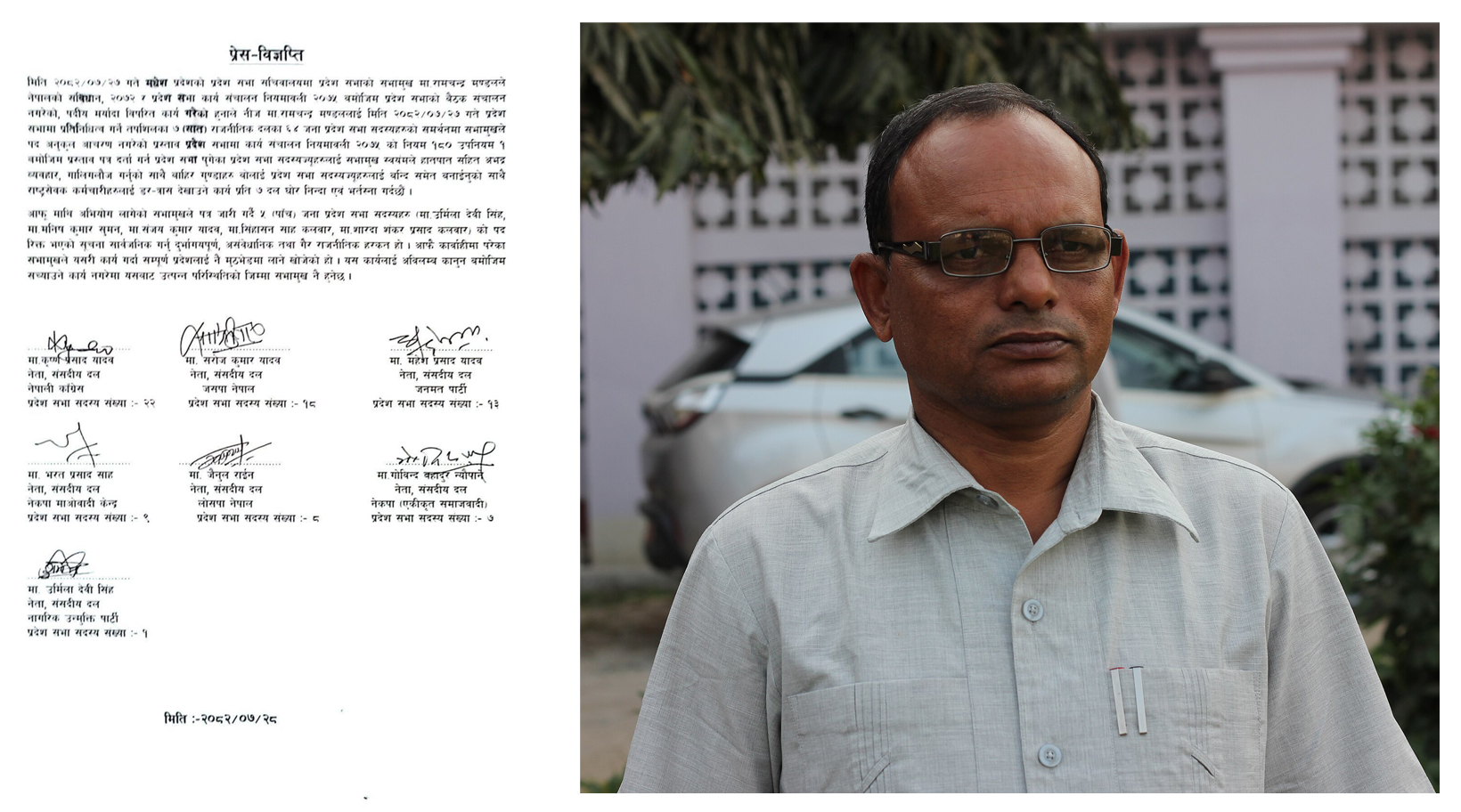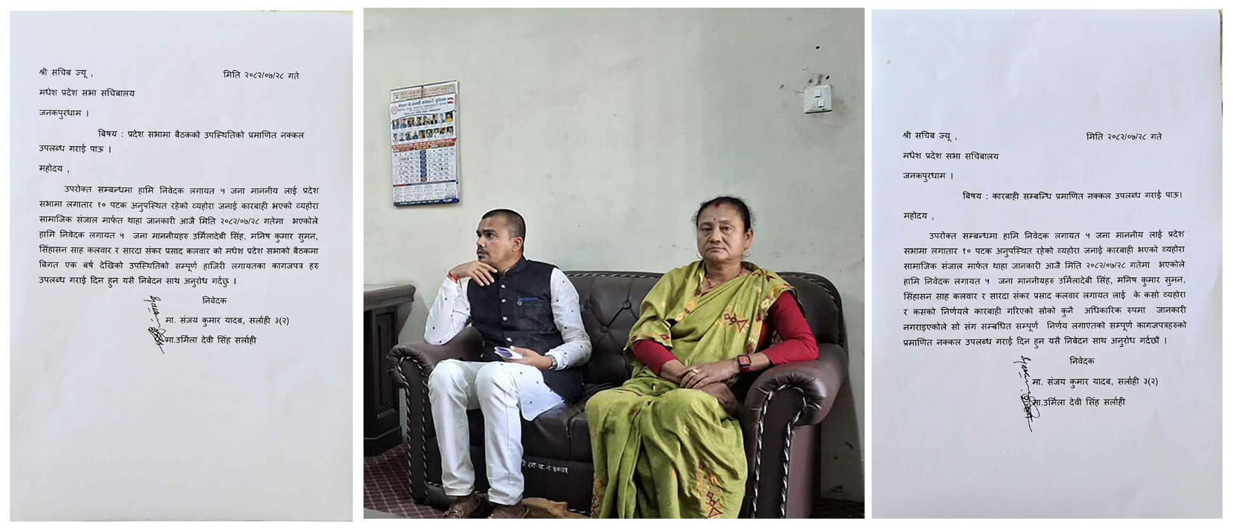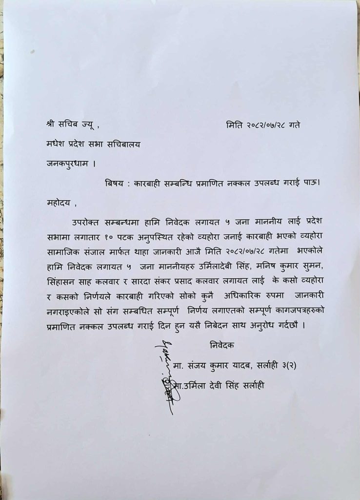 यद्यपि, कारबाहीमा परेको जसपाका सांसदहरू मनिष कुमार सुमन, सञ्जय कुमार यादव, सिंहासन सा कलवार, सारदा संकर प्रसाद कलवार र नागरिक उन्मुक्ति पार्टीकी सांसद उर्मिला देवी सिंहले प्रदेशसभासँग आज विवरण माग्दै निवेदन दिएका हुन्।