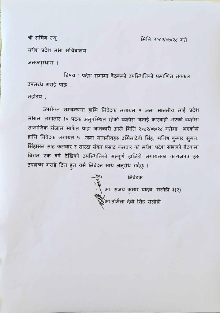 मधेश प्रदेशसभाका पाँचजना सांसदहरूले आफ्नो हाजिरी विवरण सार्वजनिक गर्न प्रदेशसभा सचिवालयसँग माग गरेका छन् ।