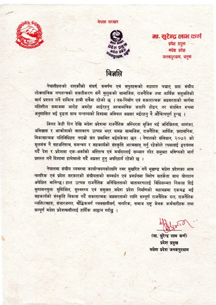 सरकार गठन संवैधानिक नरहेको भन्दै आन्दोलनरत मधेश प्रदेशका सात दलीय गठबन्धनले मधेश प्रदेशका प्रदेश प्रमुख सुरेन्द्र लाभ कर्णसित भेटघाट गरेका छन् ।
