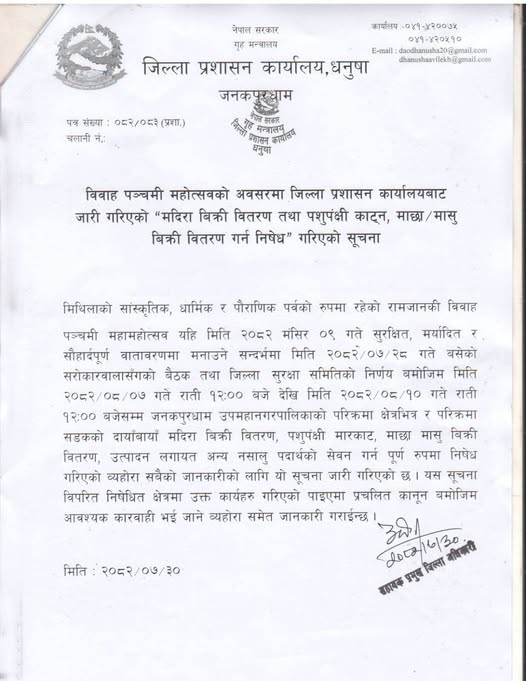 सीताराम विवाहपञ्चमी महोत्सवलाई सुरक्षित र भव्य तथा मर्यादित रूपमा मनाउन जिल्ला प्रशासन कार्यालय धनुषाले सूचना जारी गरेको छ । मंसिर ७ गते राति १२ बजेदेखि मंसिर १० गते राति १२ बजेसम्म जनकपुरधाम उपमहानगरपालिका क्षेत्रभित्र र परिक्रमा सडकको दायाँ–बायाँ क्षेत्रमा मदिरा बिक्री– वितरण, पशुपंक्षी मारकाट, माछा र मासु बिक्री–वितरण, उत्पादन तथा अन्य नसालु पदार्थको सेवन पूर्णरूपमा निषेध गरिएको जनाइएको छ ।