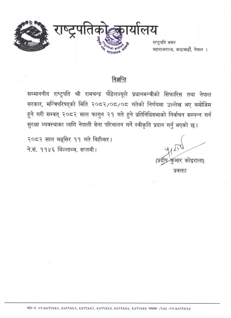 राष्ट्रपति कार्यालयका प्रवक्ता प्रदीप कुमार कोइरालाले एक विज्ञप्ति जारी गर्दै फागुन २१ मा हुने प्रतिनिधिसभा निर्वाचनको सुरक्षाका लागि सेना परिचालनको स्वीकृति दिइएको हो ।