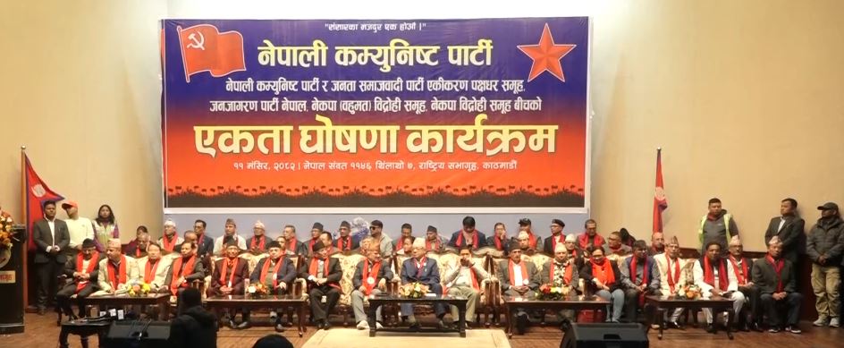 बिहीबार काठमाडौंको राष्ट्रियसभागृहमा आयोजित एक कार्यक्रमका बीच नेकपा, जसपा एकीकरण पक्षधर, जनजागरण पार्टी नेपाल, नेकपा बहुमत विद्रोही समूह र नेकपा(माओवादी) विद्रोही समूहबिच एकता घोषणा भएको हो । एकतामा आएका दलका नेताहरुलाई नेपाली कम्युनिष्ट पार्टीका संयोजक पुष्पकमल दाहाल प्रचण्ड, सहसंयोजक माधव नेपाल, झलनाथ खनाल, बामेदव गौतम लगाएतका नेताहरुले पार्टीमा स्वागत गरेका थिए ।