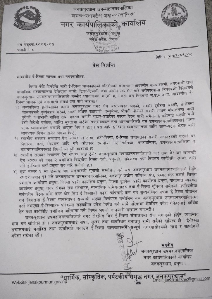 विज्ञप्तिमा स्थानीय सरकार सञ्चालन ऐन, २०७४ अनुसार टेम्पो, अटो–रिक्सा तथा ई–रिक्सा जस्ता सवारी साधनको कर निर्धारण, दर्ता, अनुमति तथा नियमन गर्ने अधिकार स्थानीय तहमा निहित रहेको स्पष्ट पारिएको छ । सोही कानुनी प्रावधानका आधारमा जनकपुरधाम उपमहानगरपालिकाले ई–रिक्सा दर्ता प्रक्रिया सुरु गरिसकेको र आगामी दिनमा सञ्चालन अनुमति तथा नियमनलाई थप प्रभावकारी बनाइने जानकारी दिइएको छ ।