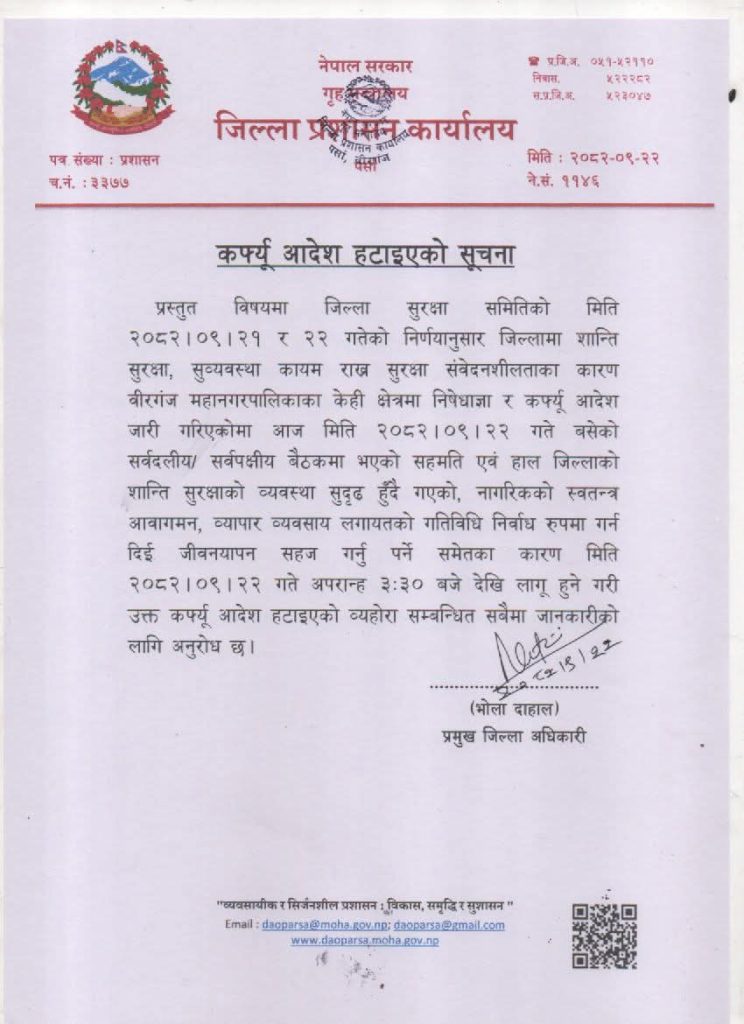 जिल्ला सुरक्षा समितिको पुस २१ र २२ गते बसेको बैठकको निर्णयअनुसार सुरक्षा संवेदनशीलतालाई ध्यानमा राखी वीरगञ्ज महानगरपालिकाका केही क्षेत्रमा निषेधाज्ञा तथा कर्फ्यु आदेश जारी गरिएको थियो। तर सर्वदलीय तथा सर्वपक्षीय बैठकबाट प्राप्त सहमति र हाल जिल्लाको शान्ति सुरक्षाको अवस्था सहज बन्दै गएको ठहर गर्दै कर्फ्यु हटाउने निर्णय गरिएको जिल्ला प्रशासन कार्यालयले जनाएको छ।