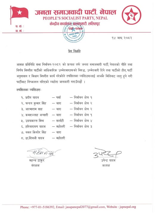 जनता समाजवादी पार्टी (जसपा) नेपालले आसन्न प्रतिनिधिसभा निर्वाचन–२०८२ मा पार्टीको आधिकारिक उम्मेदवारविरुद्ध उम्मेदवारी दिएको भन्दै आठ जना नेतालाई पार्टीबाट निष्कासन गरिएको छ ।
