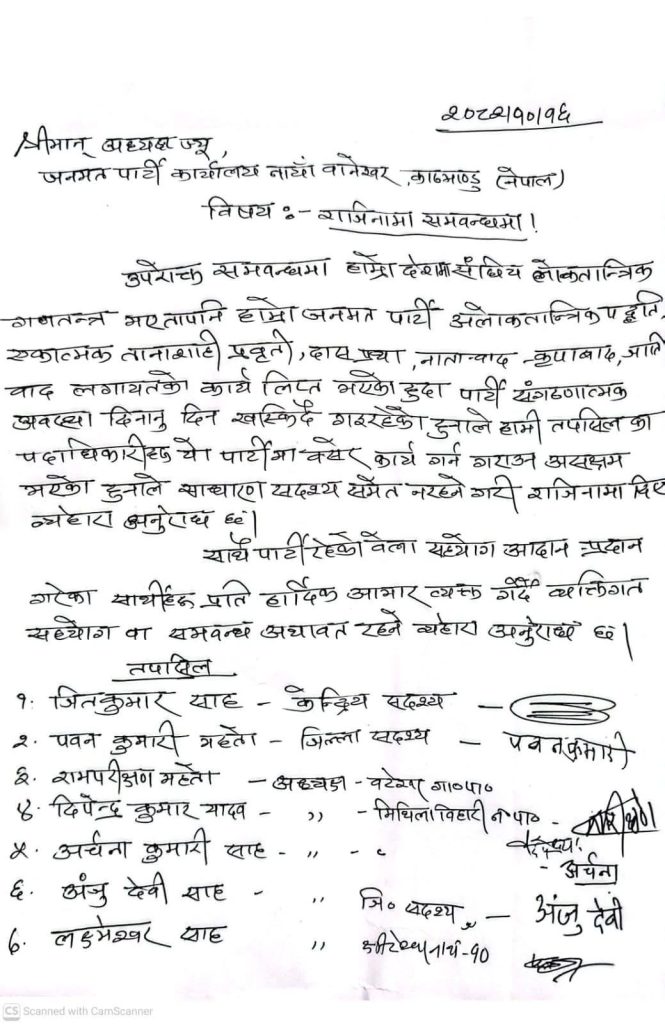राजीनामा दिनेहरूमा केन्द्रीय सदस्य साहसहित जिल्ला सदस्य पवनकुमारी महतो, बटेश्वर गाउँपालिका अध्यक्ष रामपरीक्षण महतो, मिथिला विहारी नगरपालिका अध्यक्ष दिपेन्द्र कुमार यादव, अञ्जु देवी साह लगायत रहेका छन् ।