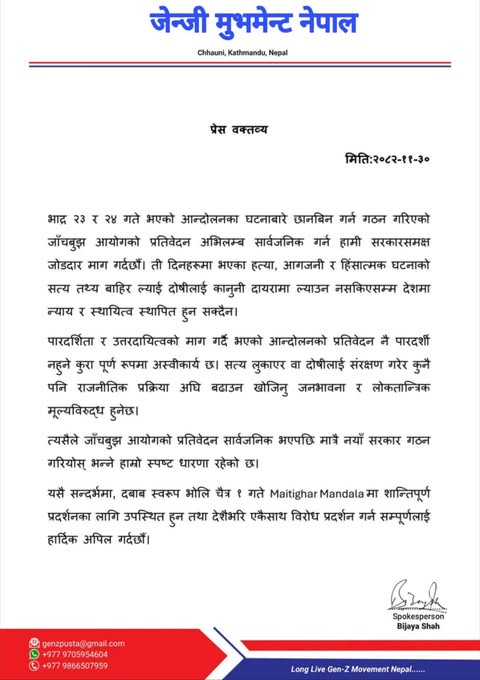 जेन-जी मुभमेन्ट नेपालले भाद्र २३ र २४ गते भएको आन्दोलनका घटनाबारे सरकारसँग प्रतिवेदन सार्वजनिक गर्न माग गरेको छ ।
