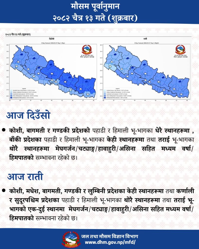 यस्तै रातिपनि कोसी, मधेस, बागमती, गण्डकी र लुम्बिनी प्रदेशका केही स्थान तथा कर्णाली र सुदूरपश्चिम प्रदेशका पहाडी र हिमाली भूभागका थोरै तथा तराई भूभागका एक-दुई स्थानमा मेघगर्जन/चट्याङ/हावाहुरी/असिनासहित मध्यम वर्षा/हिमपात हुने सम्भावना रहेको मौसम महाशाखाले जनाएको छ।