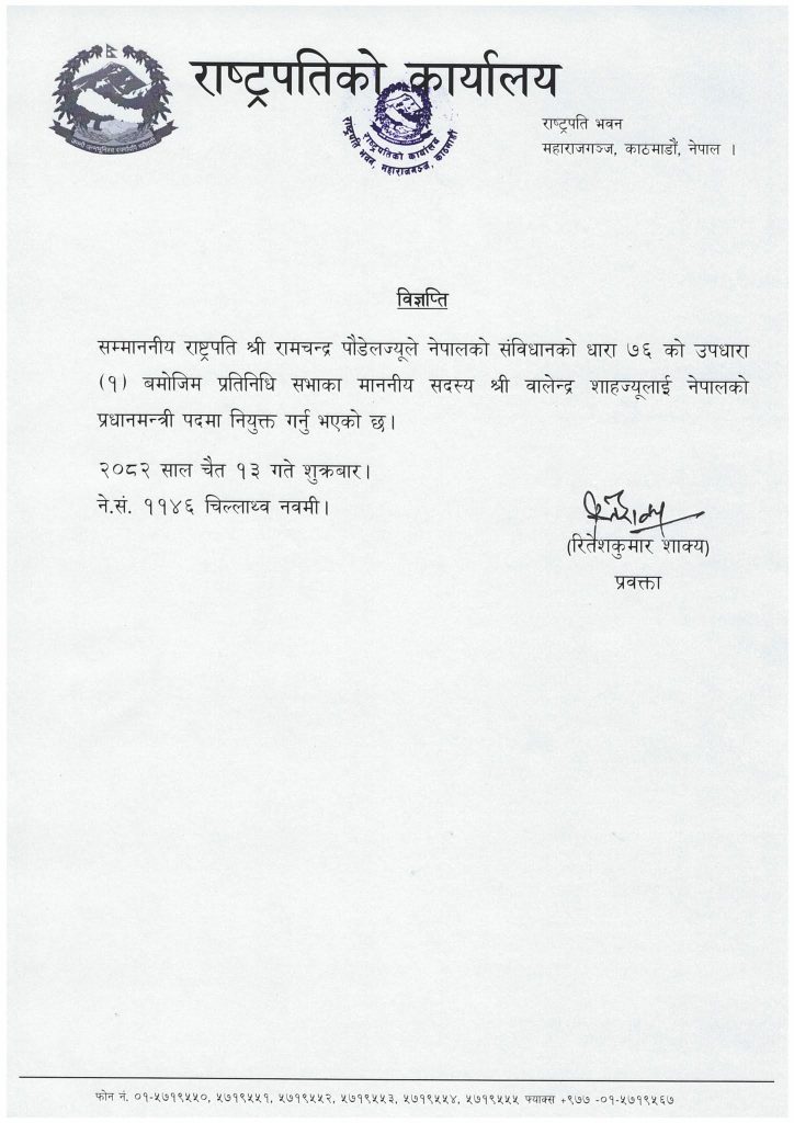 राष्ट्रपति रामचन्द्र पौडेलले आज शाहलाई प्रधानमन्त्री नियुक्त गरेको राष्ट्रपति कार्यालयले जनाएको छ ।