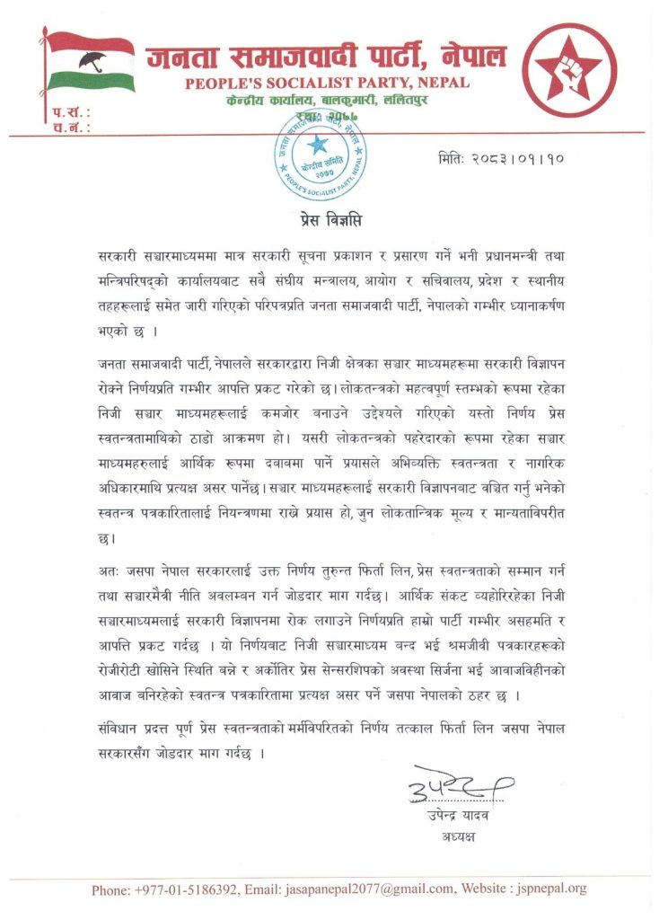 सरकारले निजी क्षेत्रका सञ्चारमाध्यमहरूलाई सरकारी विज्ञापन र सूचना उपलब्ध नगराउने गरी गरेको निर्णयप्रति जनता समाजवादी पार्टी (जसपा), नेपालले कडा आपत्ति जनाएको छ।