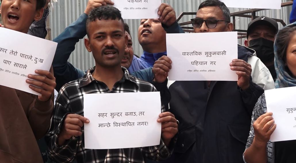 सुकुमवासी बस्ती खाली गराउने सरकारको निर्णयको बिरुद्धमा विरोध प्रदर्शन भएको छ ।