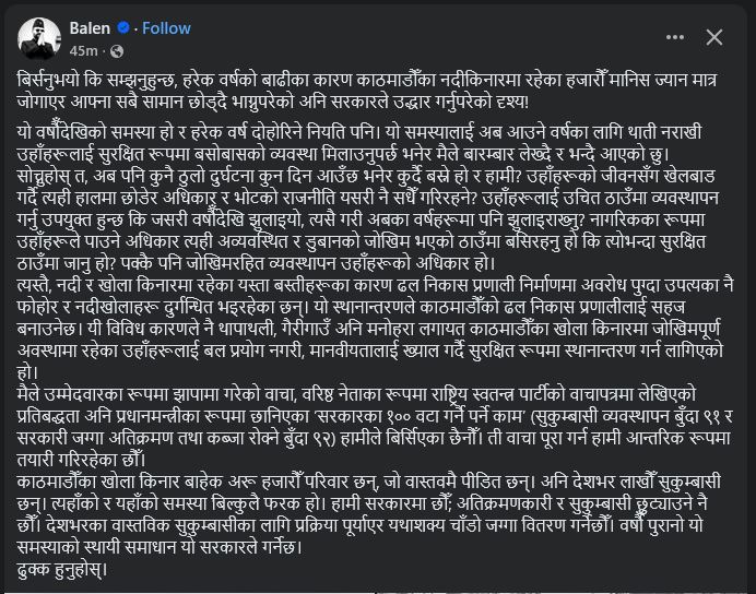 प्रधानमन्त्री वालेन्द्र शाहले काठमाडौँ उपत्यकाका खोला किनारमा रहेका सुकुम्वासी बस्तीलाई मानवीय ढंगले सुरक्षित स्थानमा स्थानान्तरण गर्ने तयारी भइरहेको बताएका छन्।