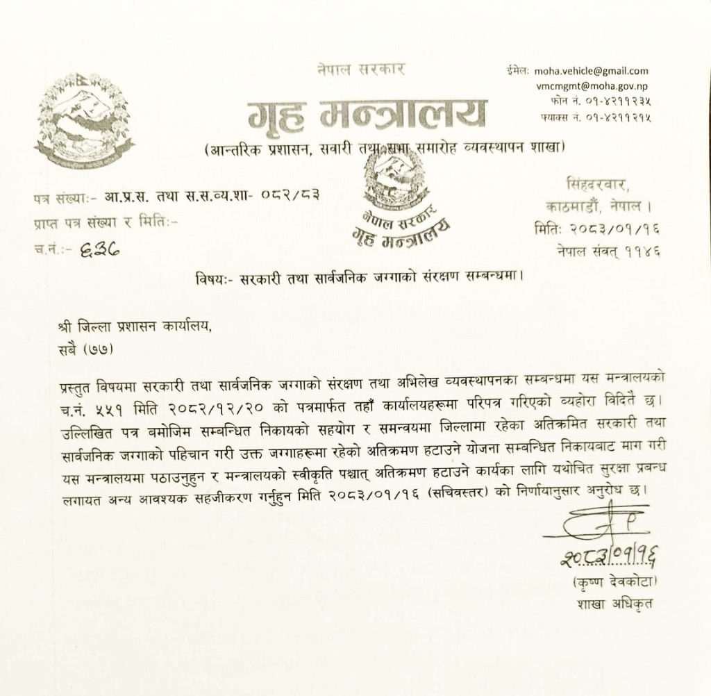 यसअघि २०८२ चैत २० गतेको मन्त्रालायको परिपत्रलाई स्मरण गराउँदै गृहले पुनः जिल्ला प्रशासन कार्यालयहरूलाई अतिक्रमित जग्गा पहिचान र संरक्षणका लागि निर्देशन दिएको हो। मन्त्रालयका शाखा अधिकृत कृष्ण देवकोटाद्वारा हस्ताक्षर गरिएको उक्त पत्रमा जिल्लास्थित सम्बन्धित निकायहरूसँग समन्वय गरी सार्वजनिक जग्गाको पहिचान गर्न र त्यहाँ रहेका अतिक्रमण हटाउने विस्तृत योजना माग गर्न भनिएको छ।